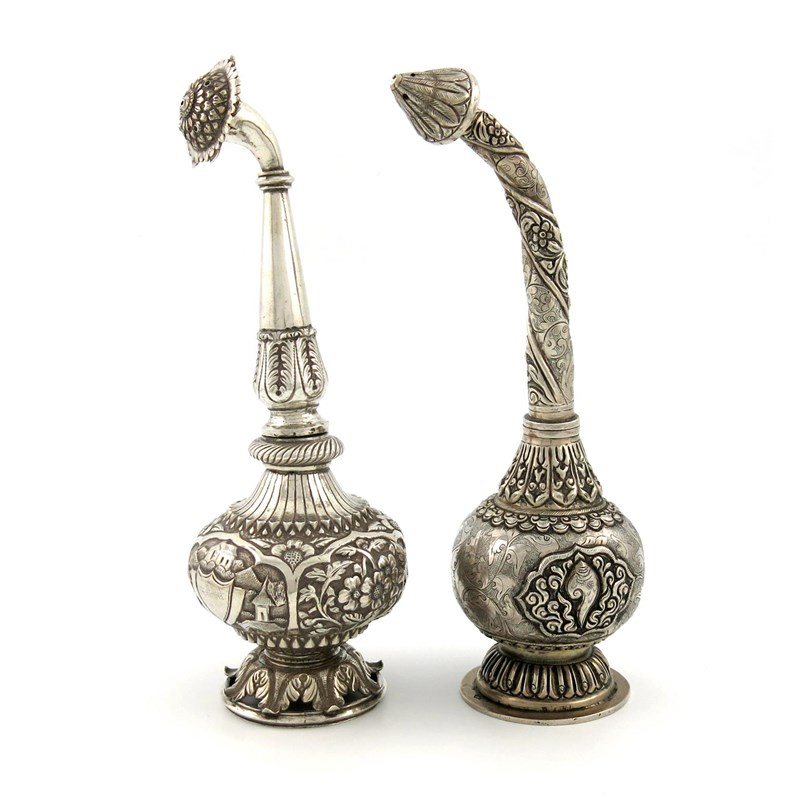 baluster form, chased foliate and village decoration, with an inscribed shield, on a raised pierced foliate foot, height 13.4cm, plus another Indian silver rose water sprinkler, chased and engraved decoration, on a circular foot, height 22.5cm, approx. weight 19oz. (2)