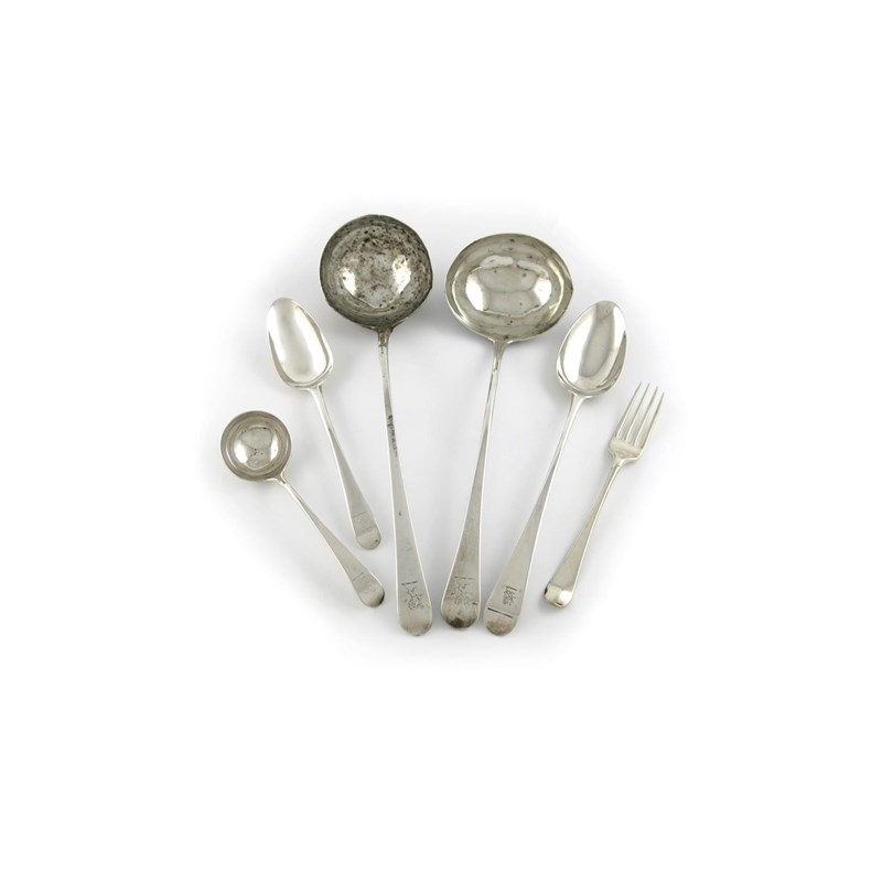 the terminals with the Wynne crest, comprising: eighteen tablespoons, by Thomas Northcote, London 1778, eighteen by Thomas Foster, London 1775, and two others, thirty-two table forks, by William Fearn and Thomas Northcote, London 1778, eight table forks by George Smith, London 1776, three further table forks, two soup ladles, three sauce ladles and a basting spoon, approx. weight 184oz. (qty)