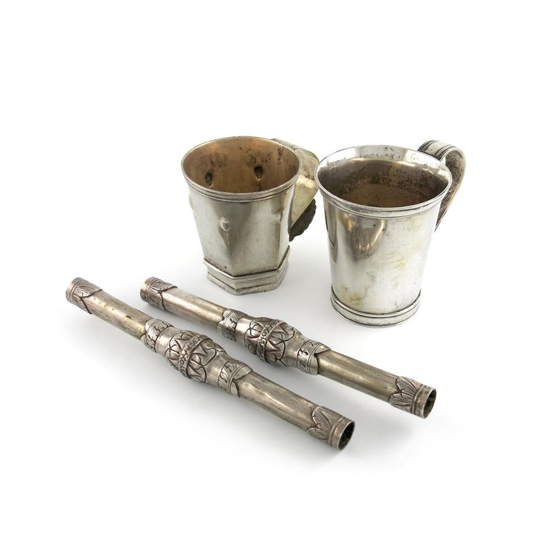 tapering circular form, scroll handle, plus another 19th century South American silver mug, the scroll handle with a fluted motif. the faceted body with a punch motif, plus two unmarked South American batons, approx. total weight 44oz. (4)