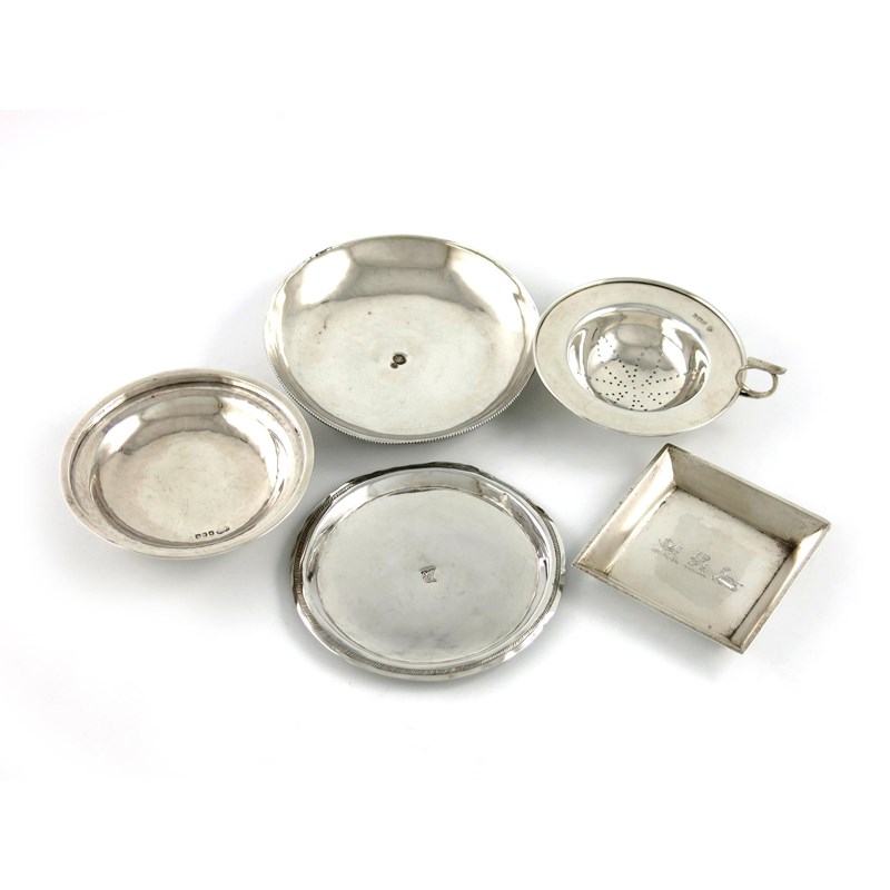 comprising: a Victorian silver square dish, by George Fox, London 1882, engraved with the Wynne, Finch, and Griffith crests, plus a silver sugar bowl cover, a tea strainer and two Turkish dishes, approx. weight 11.2oz. (5)