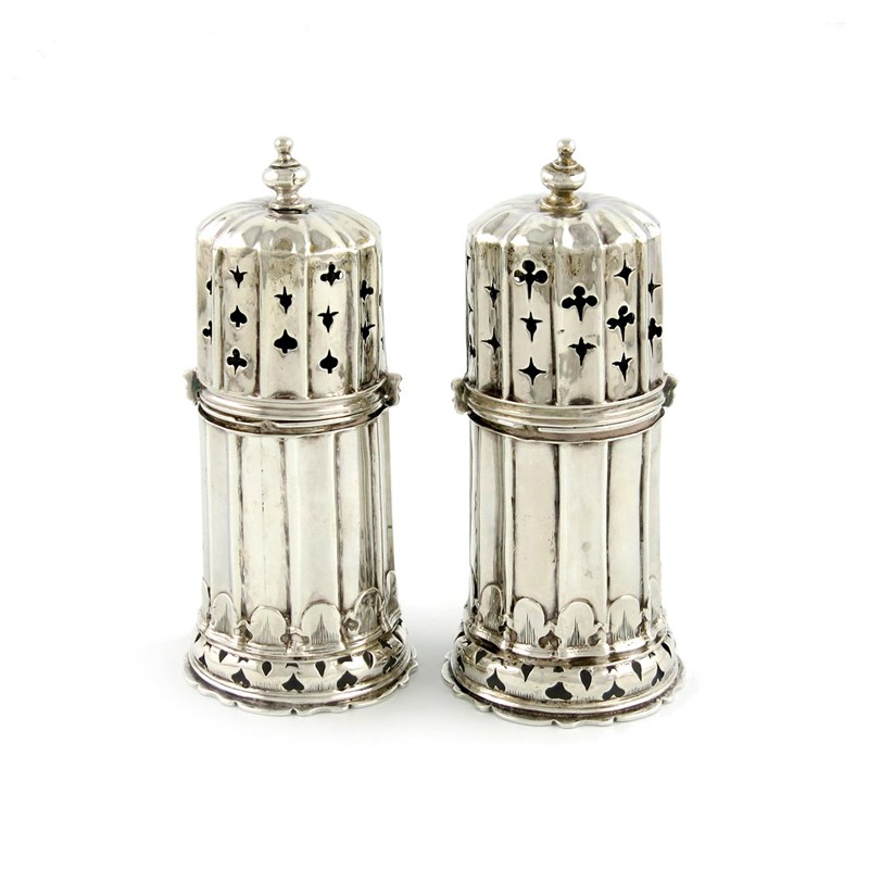 fluted lighthouse form, bayonet fitting pierced covers with knop finials, on raised pierced circular bases with engraved decoration, height 13.8cm, approx. weight 10oz. (2)