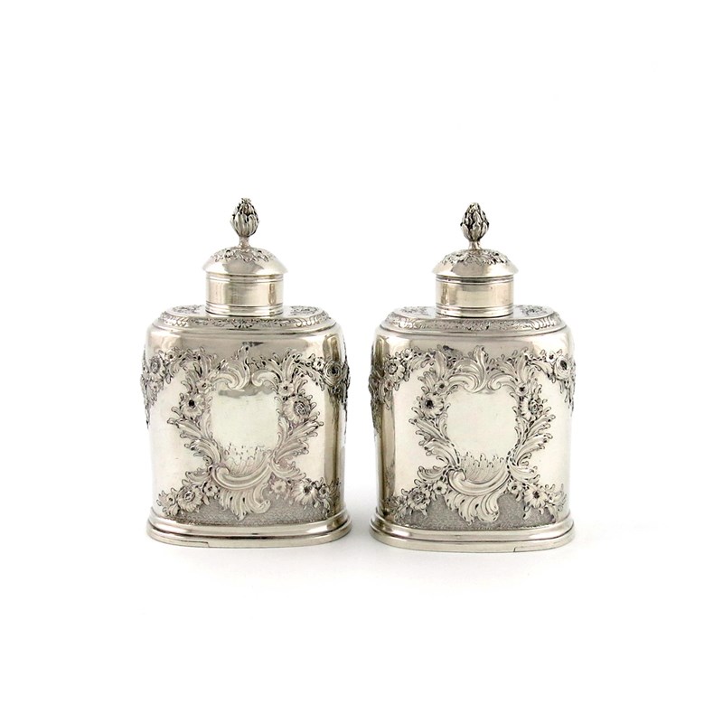 oblong form, chased foliate decoration, pull-off covers with foliate finials, slide-off bases, with detachable lead liners, height 14.5cm, approx. weight 19.8oz. (2)