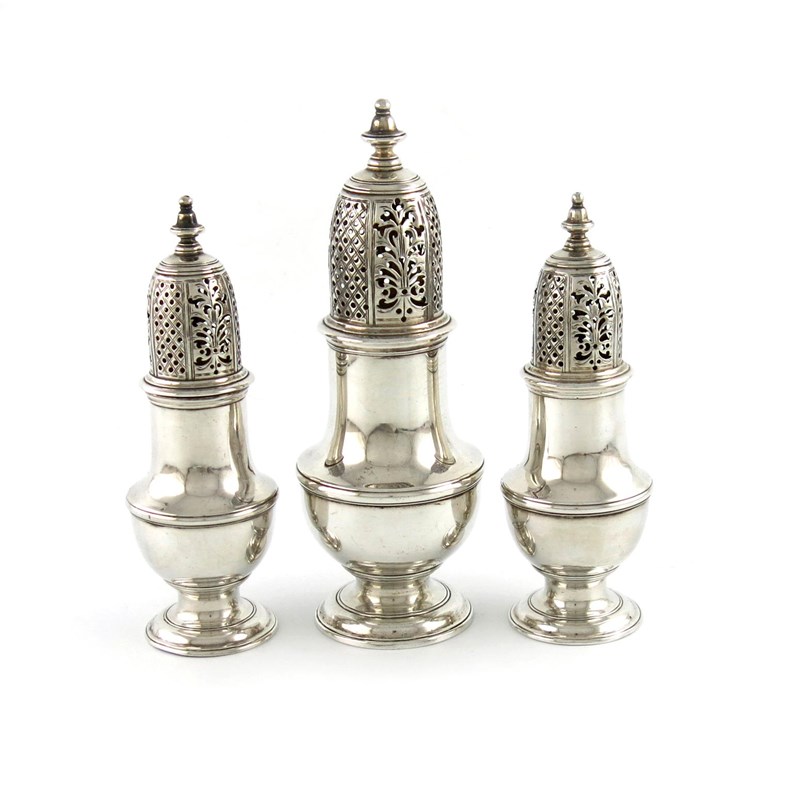 baluster form, the pull-off pierced cover with an acorn finial, on a raised circular foot, height 18.5cm and 15.2cm, approx. weight 16oz. (3)