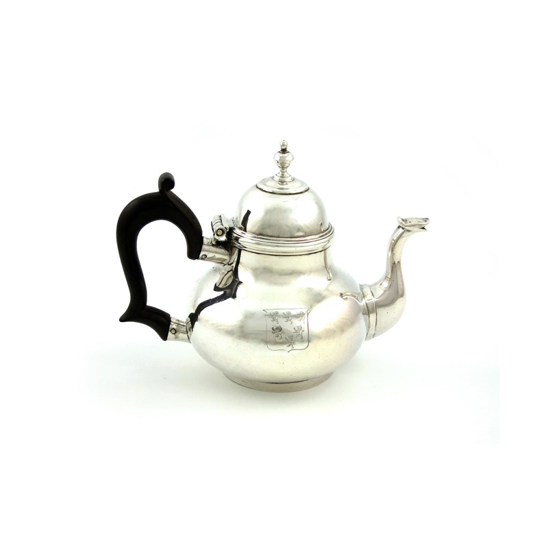 pear form, scroll handle, domed hinged cover with a knop finial, engraved with an armorial shield length handle to spout 19cm, approx. weight 13.7oz.