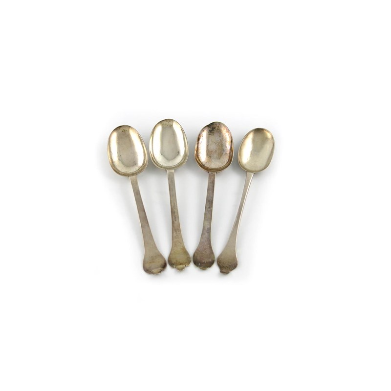 the oval bowl with a ribbed rat-tail, the reverse of the terminal scratch initialled 'W.D', length 20.6cm, plus a similar Trefid spoon with maker's mark of IS four times, possibly for John Smith II of Taunton / Barnstable, circa 1690, and an early 18th century provincial Dog-nose spoon, probably marked D in a wavy edge punch five times, the reverse of the terminal scratch initialled 'I.D' over 'H.D', '1721', approx. total weight 6.9oz. (4)