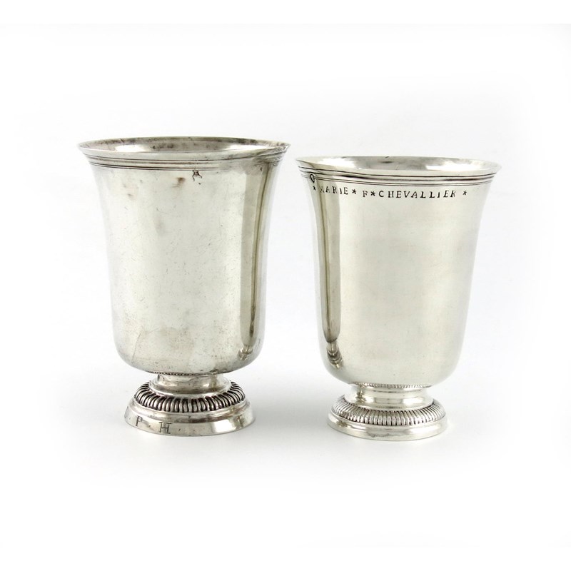 tapering circular form, on a raised circular foot, with a rope-work border, height 11.8cm, plus another 18th century French silver beaker, Paris 1789, tapering circular form, on a raised circular foot, with a rope-work border, inscribed 'Marie F. Chevallier', height 11.3cm, approx. weight 10.5oz. (2)