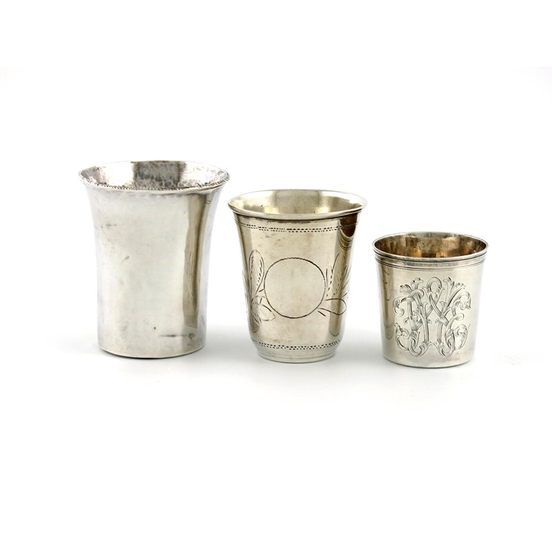 comprising: a French beaker, Paris 1797-1809, tapering circular form, engraved with a monogram, plus a Russian beaker, tapering form, engraved decoration and an unmarked beaker made from a coin, approx. weight 2oz. (3)