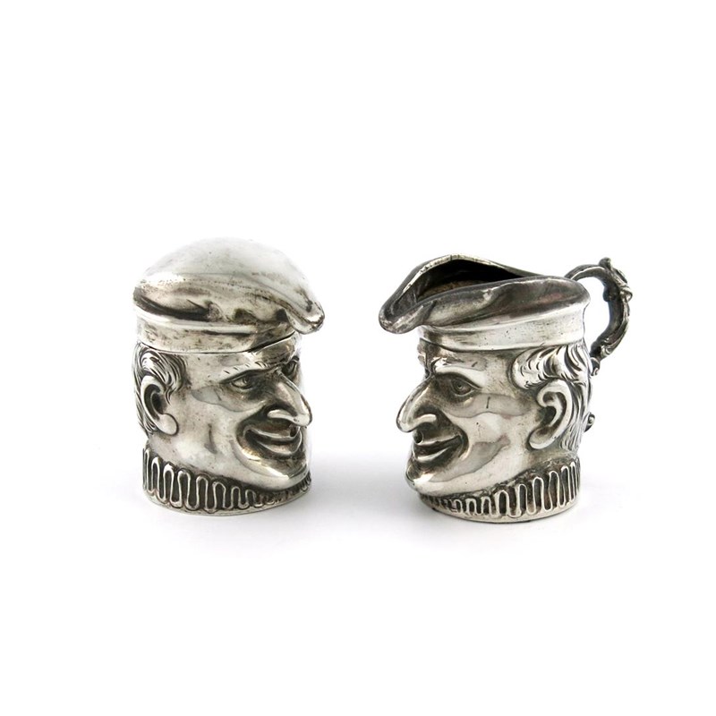 A continental novelty small silver toby cream jug and sugar bowl and cover