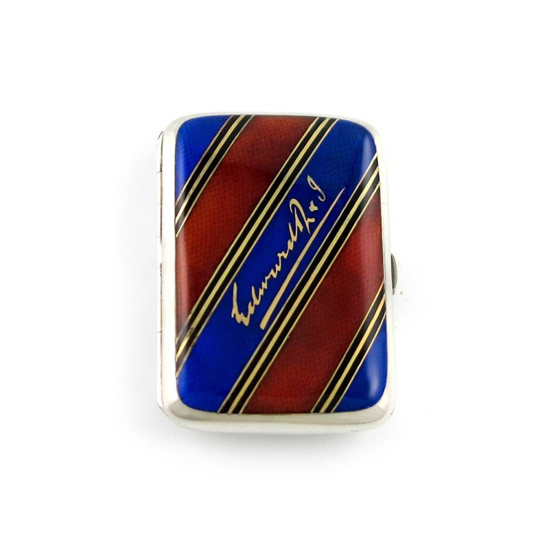 rectangular form, the hinged cover with the signature of Edward VII in gold lettering on an enamelled ground of striped blue, red and black enamel with gold coloured stringing, length 8.7cm, approx. weight 3.7oz.