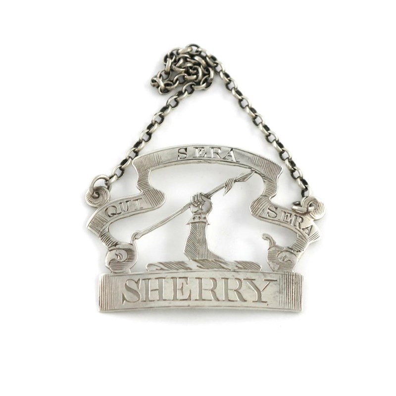 rectangular form, mounted with an arm and hand holding a spear and with the motto in a banner 'QUI SERA SERA', pierced 'SHERRY', length 6cm, approx. weight 0.4oz.