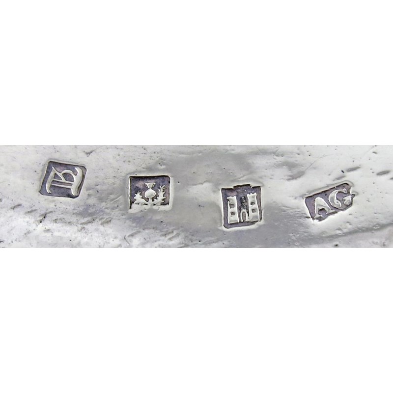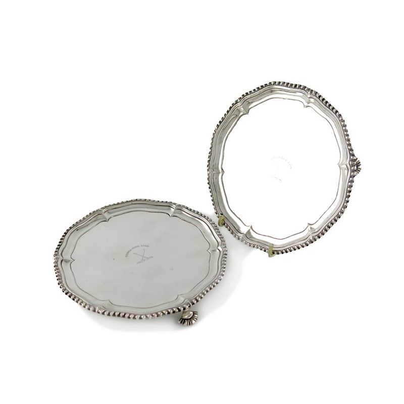 circular form, gadroon border, on three fluted hoof feet, the centres with a crest and motto, diameter 17.2cm, approx. weight 20oz. (2)