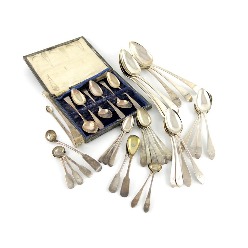 comprising: a set of six George III Celtic Point pattern tablespoons, by Alexander Henderson, Edinburgh 1798, plus a set of eight dessert spoons, Edinburgh 1795, a pair of sugar tongs, by J. Douglas, Dundee circa 1800, two sets of six teaspoons, three further teaspoons, and eight condiment spoons, approx. weight 31oz. (qty)