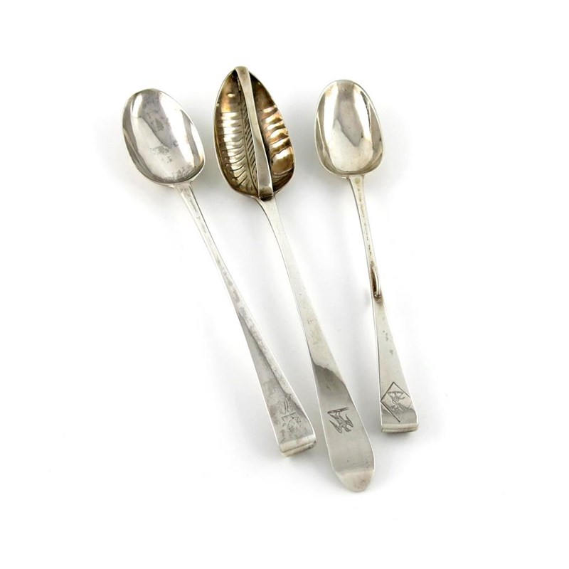 the terminal with a crest and initial, the reverse of the terminal with scratch initials, plus another George III Irish silver hook-end basting spoon, marks worn, possibly by John Craig, Dublin circa 1763, with two applied wire-work hooks, the terminal with a widow's lozenge, plus a George III Irish silver Celtic Point pattern silver straining spoon, by John West, Dublin 1803, approx. weight 12.5oz. (3)