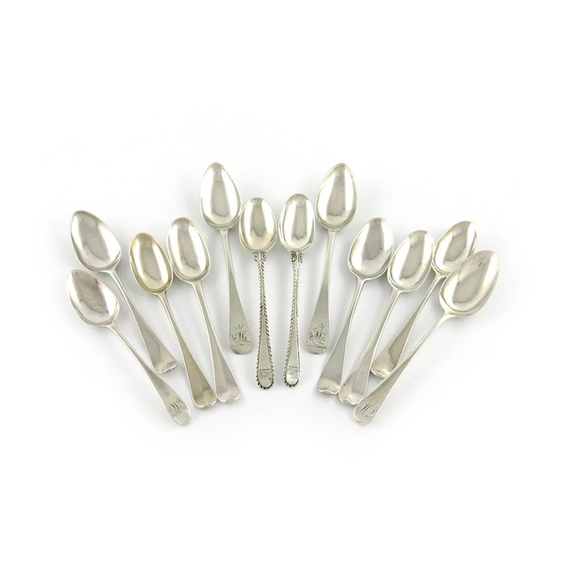 comprising: a Hanoverian pair, by Philip Roker, two further Hanoverian pairs, a York pair by Barber and Whitwell, two single York examples and a pair of feather-edge spoons with shoulders, by T and W Chawner, approx. weight 6oz. (12)