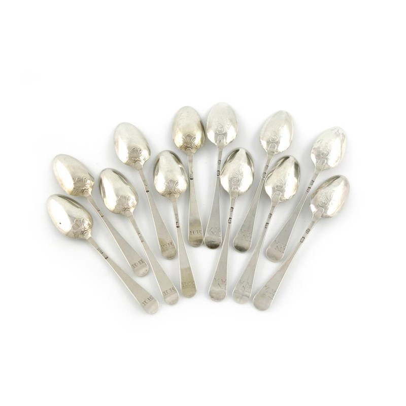 Provenance: the scroll back teaspoons purchased from Barbara Cattle, York, 23 March 1994, the shell back teaspoons, purchased from Shredds of Portobello, 18 June 1996.