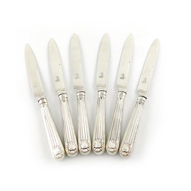 the plain blades with a crest, tapering reeded handles with shell motifs, length 21.4cm. (6)