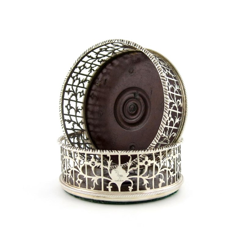 circular form, pierced foliate scroll decoration, gadroon borders, with turned wooden bases, with a crest, diameter 11.5cm, height 4.5cm. (2)