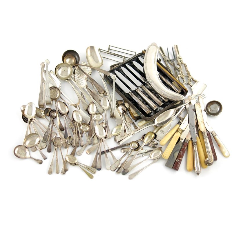 comprising silver items: a George III Bright-cut basting spoon, by Hester Bateman, London 1784, a pair of knife rests, London 1804, a mote spoon, a tablespoon, four ladles, two dessert spoons, three pairs of sugar tongs, a pair of wishbone sugar tongs, nine fruit knives with various handles including agate, thirty-two teaspoons, a sifting spoon, two caddy spoons, a marrow spoon, twenty-two condiment spoons, a fruit knife, a fork, a cased set of six butter knives, a butter knife, and a nut pick, plus electroplated items: a stilton scoop, a crumb brush mount, two pairs of grape scissors and a toddy ladle, approx. weighable 41oz. (qty)