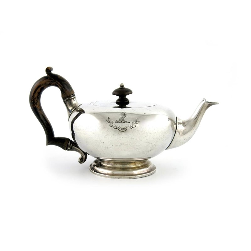 plain bullet form, flush hinged cover with a knop finial, scroll handle, on a raised circular foot, length handle to spout 23.2cm, engraved with a crest and motto, approx. weight 18.4oz.