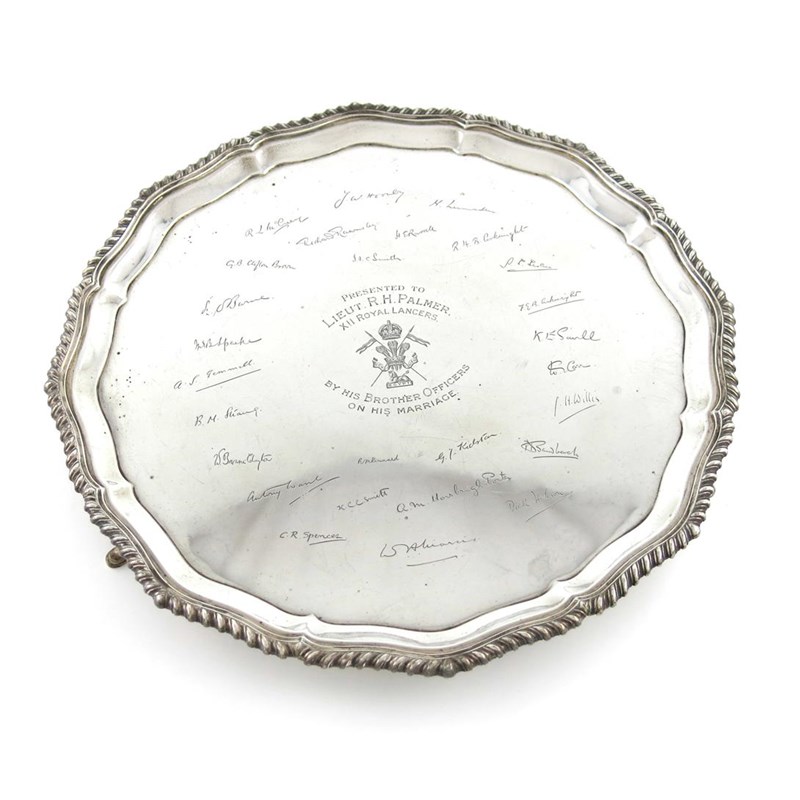 circular form, gadroon border, on three hoof feet, the front engraved with a presentation inscription and facsimile signatures, diameter 42.5cm, approx. weight 72oz.