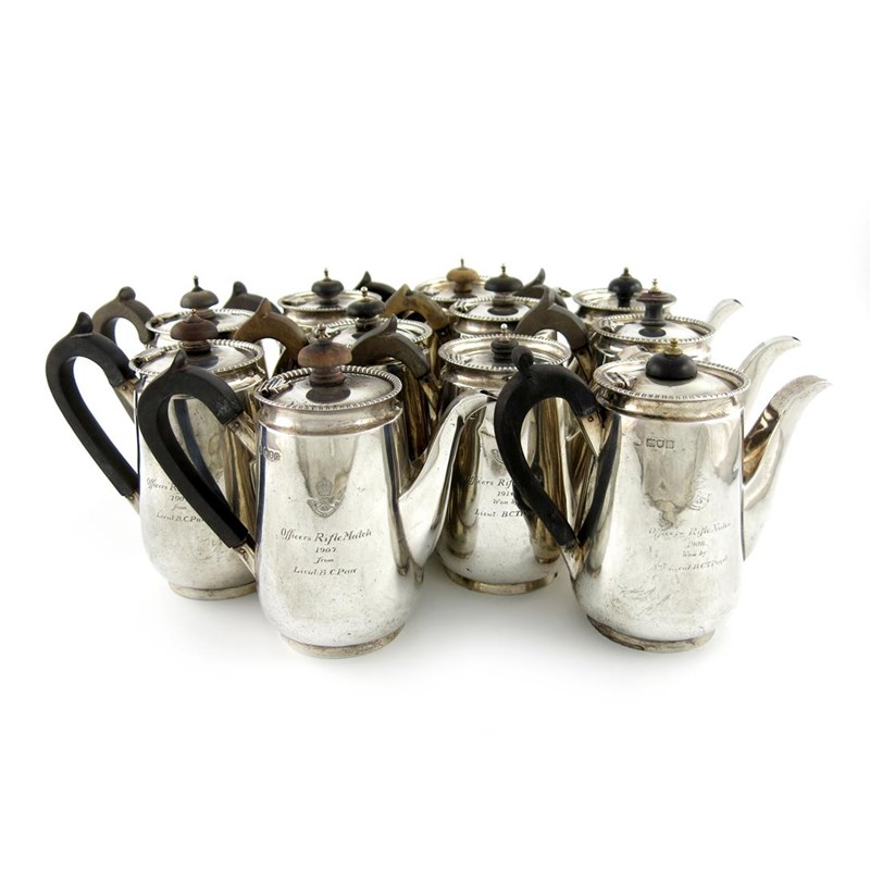 tapering circular form, scroll handles, various finials, engraved with the regimental badge and 'Officers Rifle Match', with the names of the donors, height 15cm, approx. weight 150oz. (11)