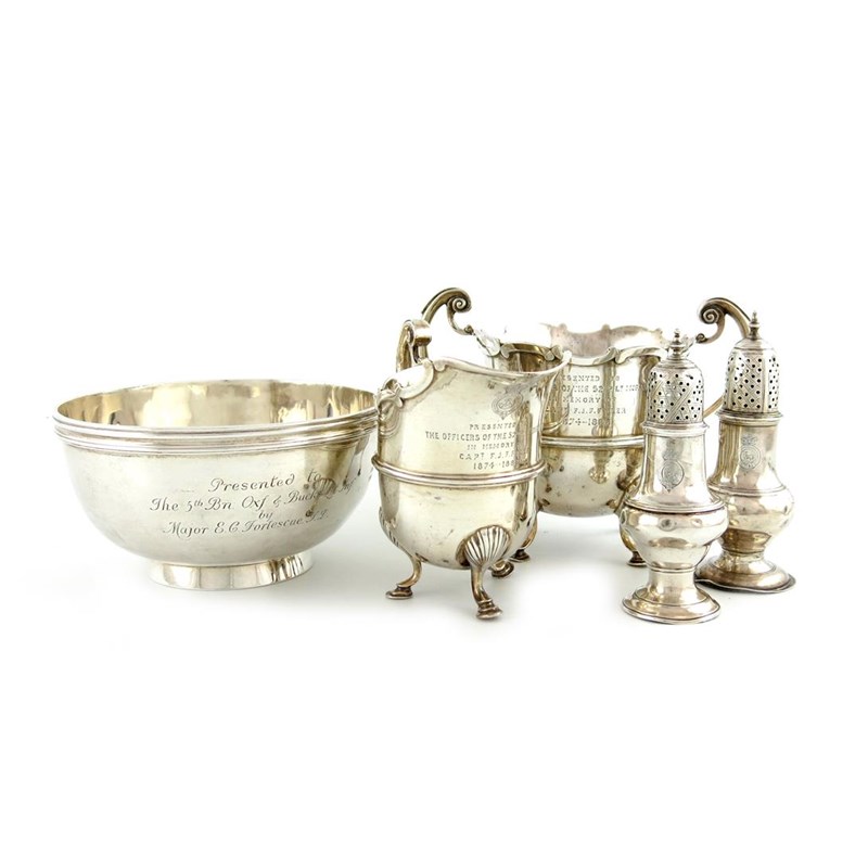 comprising: a Victorian cream jug and sugar bowl, London 1887, with the regimental badge of the Oxfordshire Light Infantry and with an inscription to the officers, plus a circular bowl, 'The North Challenge Bowl, London 1905, and two George III casters, London 1774, the other date letter rubbed, later inscriptions, approx. weight 38oz. (5)