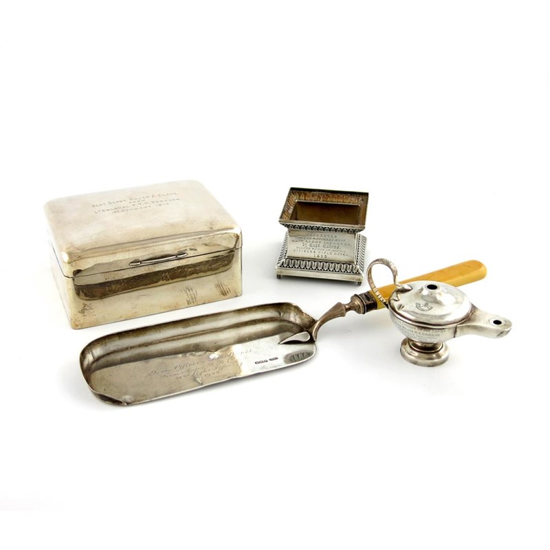 comprising: a cigarette box, Birmingham 1916, the cover with a presentation inscription, plus a crumb scoop, with an ivory handle, Sheffield 1921, a table cigar lighter modelled as an oil lamp, and a square stand, approx. weight 10oz. (4)