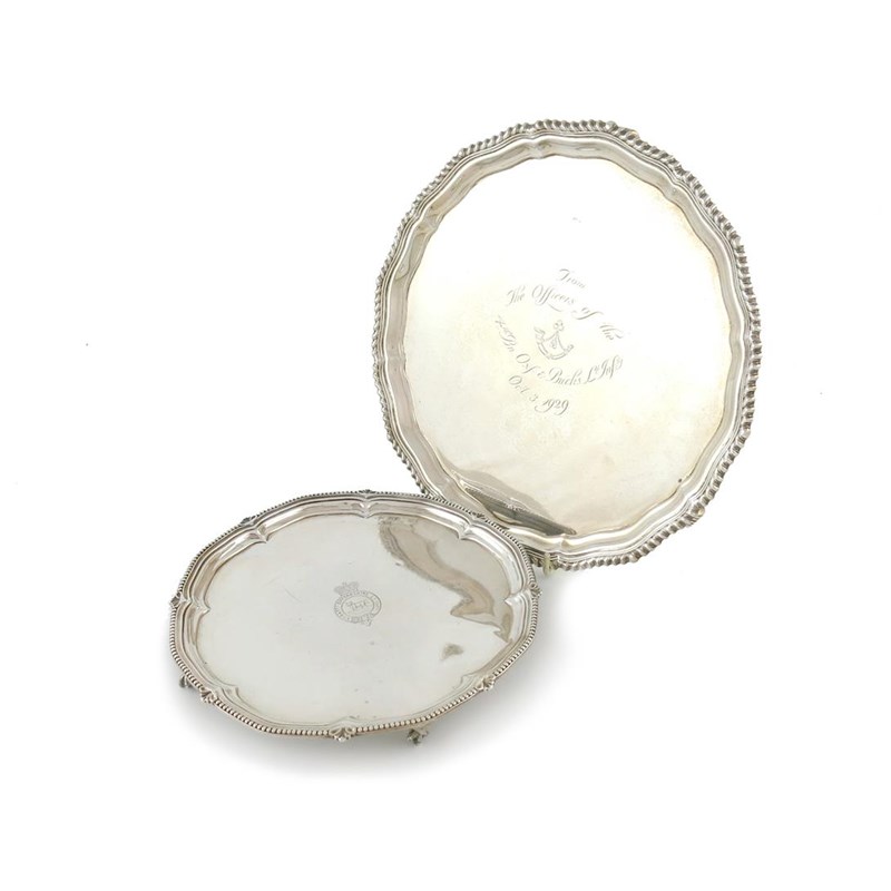 circular form, gadroon border, inscribed 'From the Officers of the 4th Bn. Oxford and Bucks Light Infantry, October 3, 1929', diameter 26.3cm, plus a presentation silver waiter, Sheffield 1894, approx. total weight 31.9oz. (2)