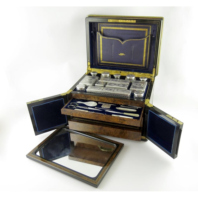 with engine-turned decoration and chased foliate scroll borders, initialled, hob-nail cut glass bodies, comprising: three scent bottles, and ten various toilet jars / boxes, plus a twelve-piece manicure and writing set, with mother-of-pearl handles, a gold toothpick, and a vinaigrette, by E. Smith, Birmingham 1861, in a fitted velvet lined drawer with a push-button opening, in a fitted brass bound walnut case, the interior of the cover fitted with a mirror and a stationary wallet, the front with a jewellery drawer and another drawer, the hinged cover initials with an inscribed brass cartouche 'F. E. Edwards 28 November 1866', length of case 33.3cm, approx. weighable 9.8oz.