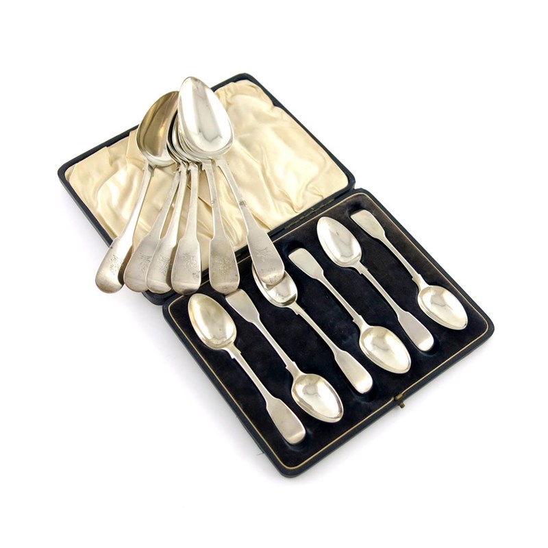 crested, plus a set of six William IV silver Fiddle pattern teaspoons, by William Chawner, London 1831, in a fitted case, approx. weight 19.5oz. (12)