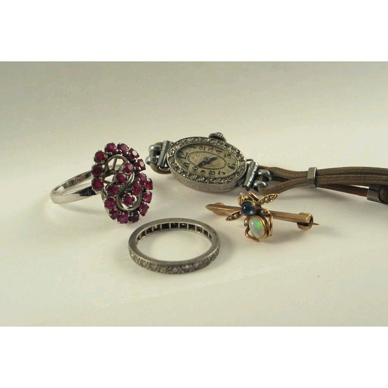 A diamond full circle eternity ring, set in platinum, size N; a diamond set cocktail wristwatch, platinum case; a small bee brooch, the opal, cabochon sapphire and seed pearls are set in gold, and a ruby set cluster ring.