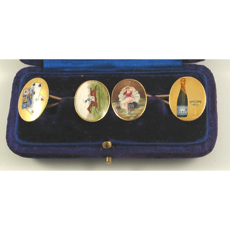 A pair of early 20th century enamelled gold cufflinks, the oval plaques depicting the 'four vices of man,' as playing cards, a race horse and jockey, a dancing girl and a bottle of Moet with glass, in 18ct gold with figure of eight links, case.