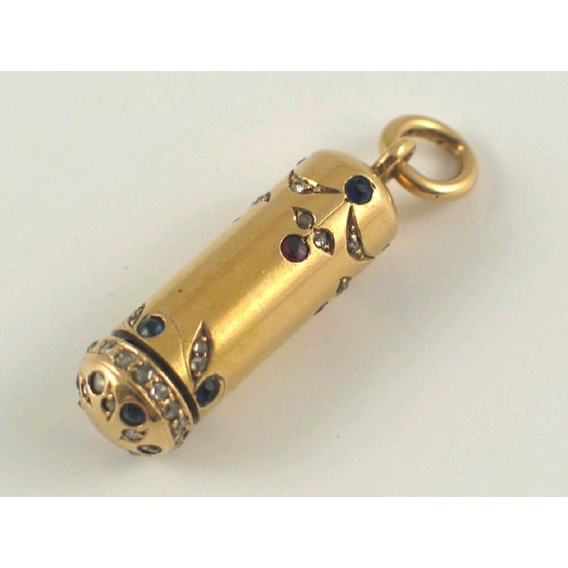 An 18ct gold propelling pencil pendant, set with diamonds, rubies and sapphires, 3cm and 7.6cm extended.