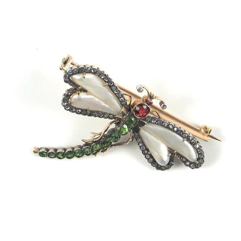 A late 19th century gem set dragonfly brooch, the wings formed with pearls within a border of rose cut diamonds with garnet head and the body formed with a line of graduated circular cut demantoid garnets, set in gold. 4.5cm.