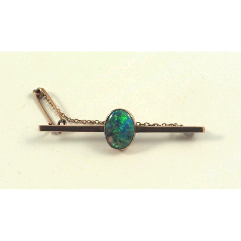 An opal bar brooch, set with an oval shaped solid black opal, in gold.