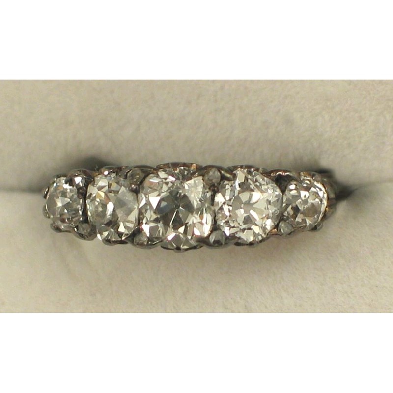 A late 19th century diamond five stone ring, set with five graduated circular cut diamonds, with rose cut diamond pointers (one missing), to the carved gold shank.