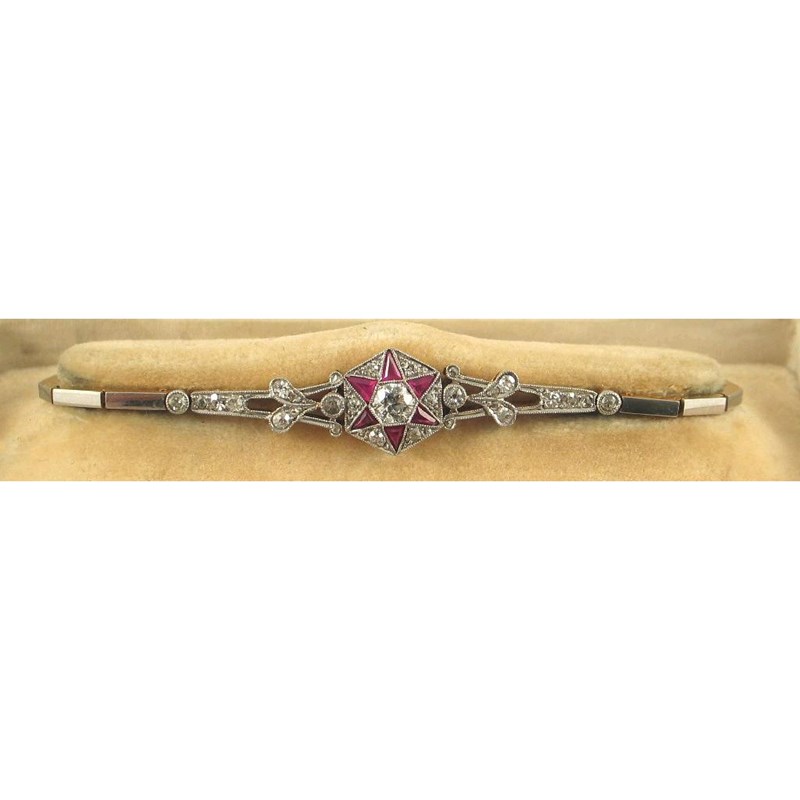 An Edwardian diamond and ruby bracelet, the centre circular cut diamond is set with six triangular shape rubies, and further diamonds to the shoulders, set in platinum on gold, case by Mappin & Webb.