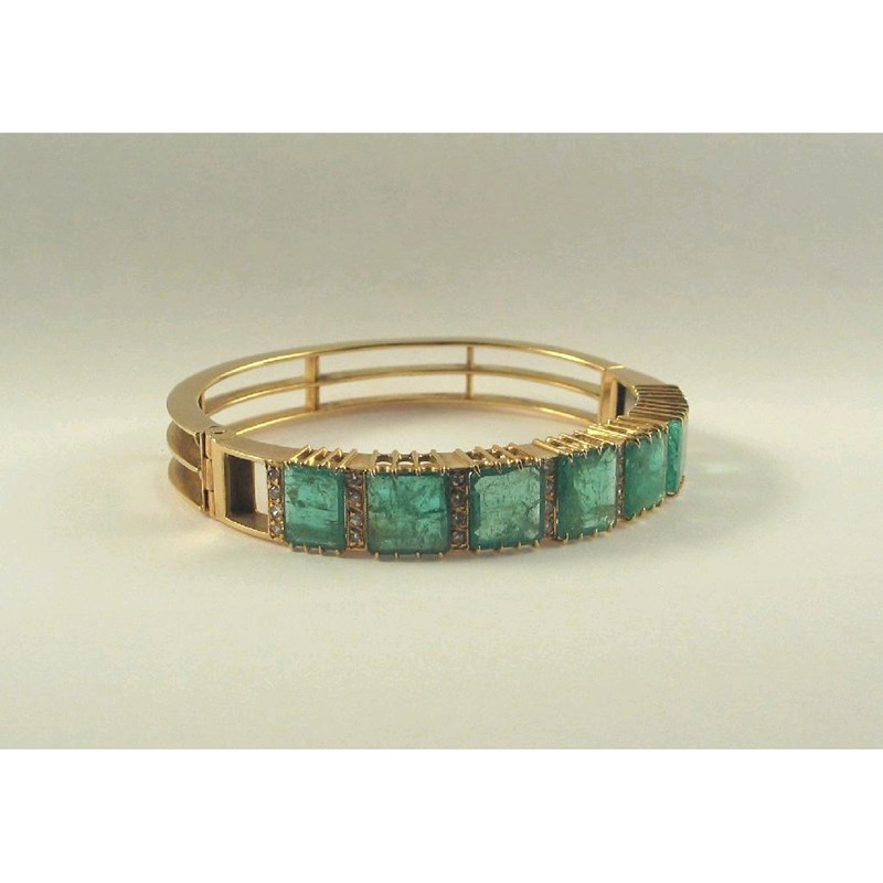 An emerald and diamond bracelet, mounted with seven square shaped emeralds, each divided with four small brilliant cut diamonds in gold.