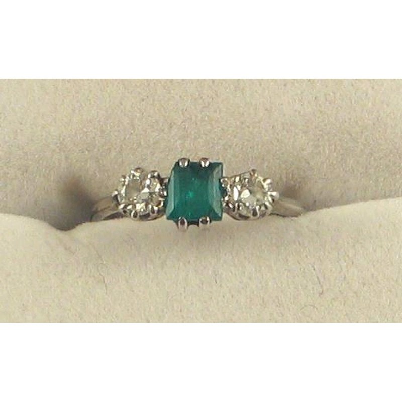An emerald and diamond three stone ring, the chipped emerald is set with two circular cut diamonds in white gold.