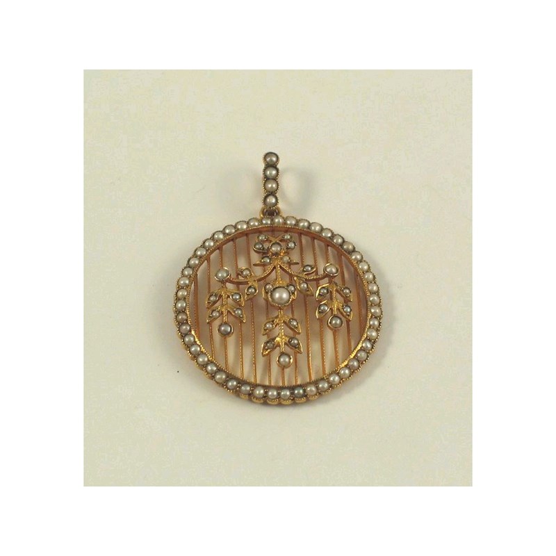 A circular gold pendant c.1900, the centre a half pearl set garland against a knife wire grille