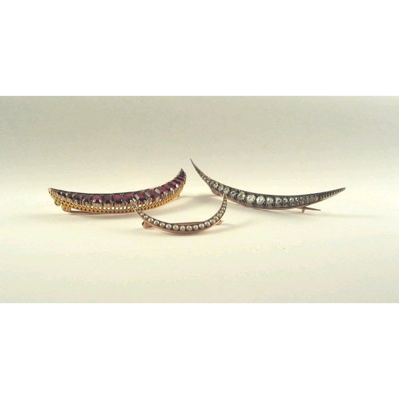 Three Victorian gem set crescent brooches, one of graduated rose diamonds in silver on gold, one of graduated half pearls and the third of graduated garnets set in gold. (3)