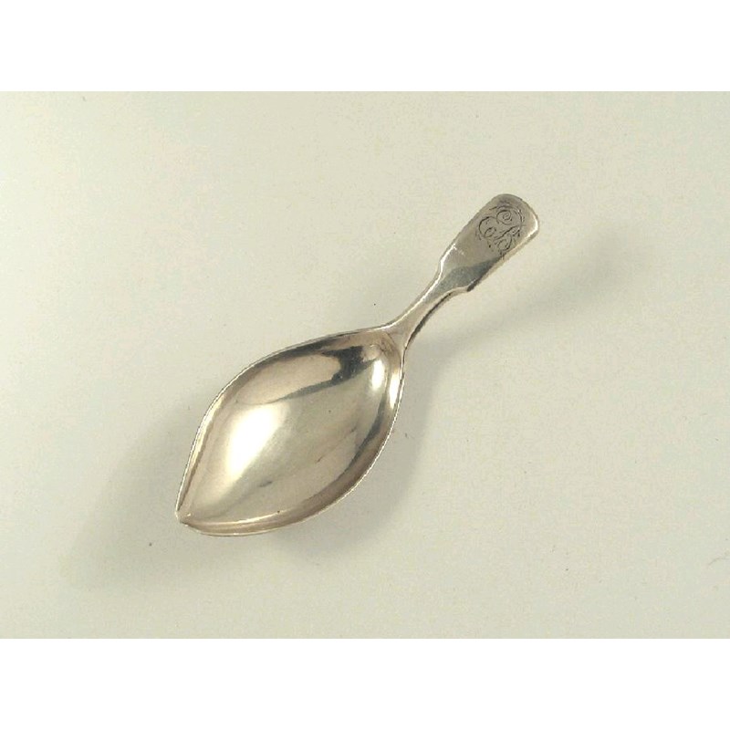 A George III fiddle caddy spoon, with a leaf shaped bowl, initialled 'EB' by William Pugh, Birmingham 1814.