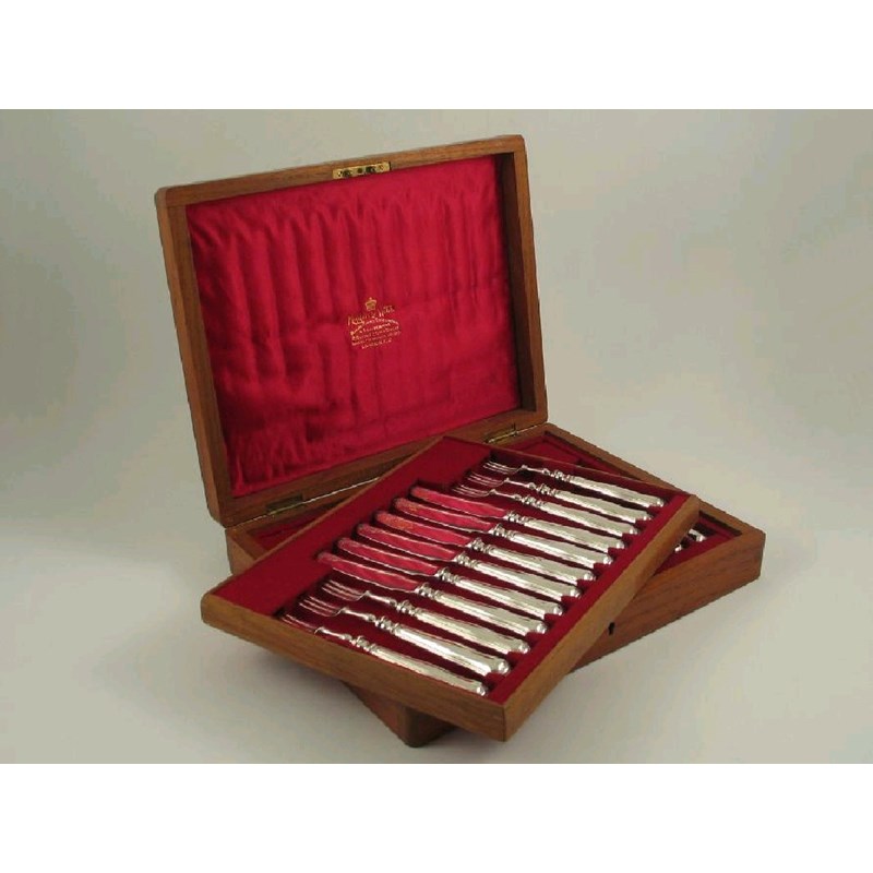 A cased set of twelve pairs of plated fruit knives & forks