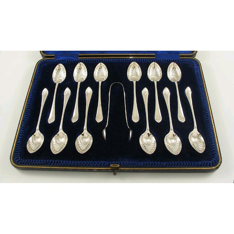 An Edwardian cased set of twelve teaspoons, and a pair of sugar tongs, with shell bowls, by Joseph Rogers, Sheffield 1905/6.