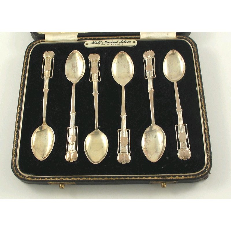 A modern matched set of six teaspoons, with stylized foliate stems, each stamped 'CYMRIC,' two with makers mark of Liberty & Co, four with makers mark L.C&C.Ltd, Birmingham 1902.