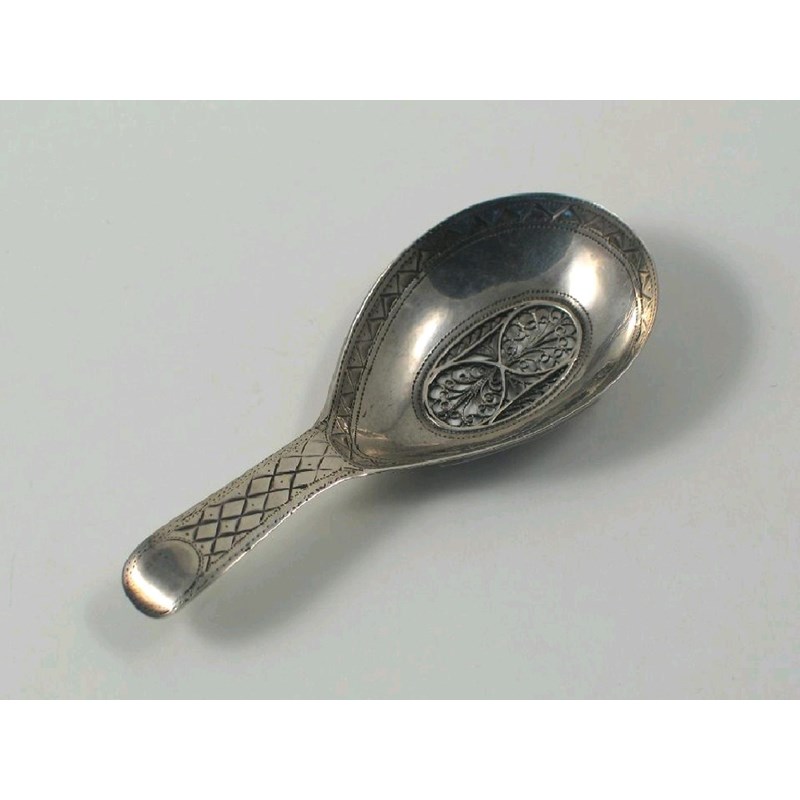 A George III engraved caddy spoon, with an unset filigree panel in the bowl, by Samuel Pemberton, Birmingham c.1800 (date letter unclear) .