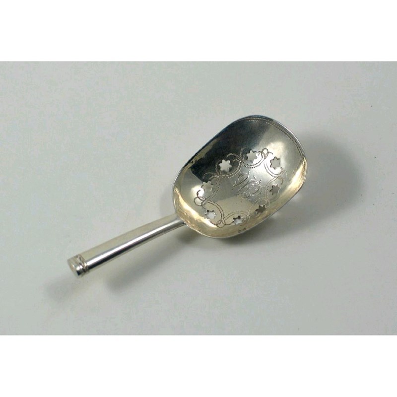 A George III caddy scoop, with a hollow tubular handle, the bowl pierced with eight mullets and initialled by Joseph Taylor, birmingham 1805.