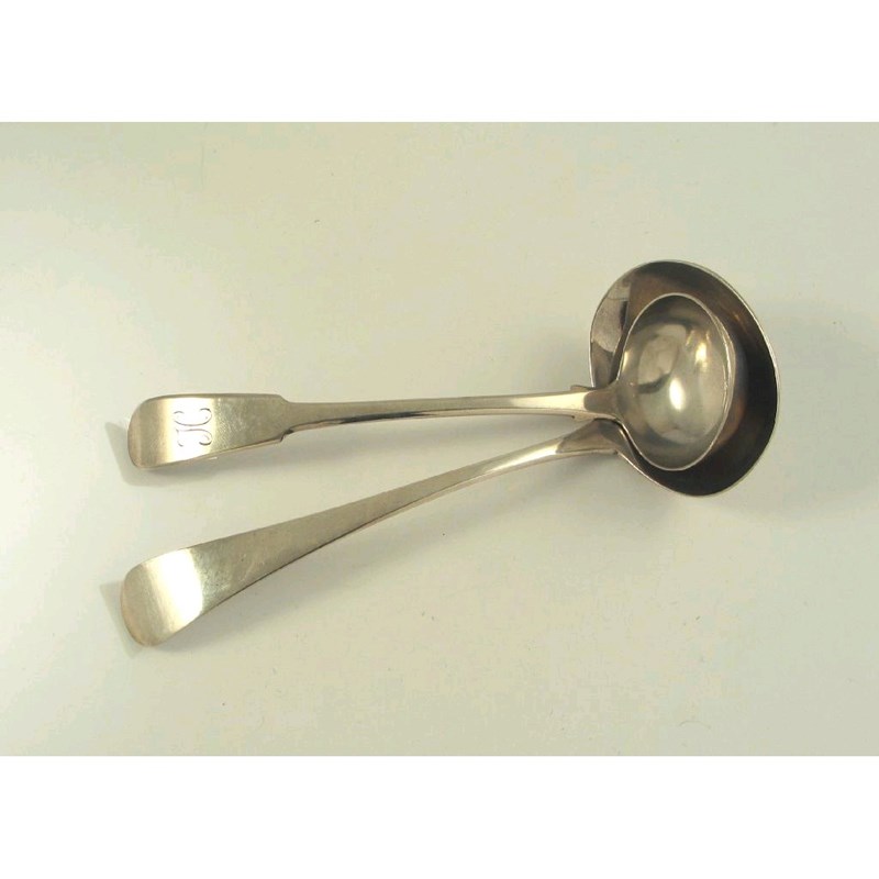 A Victorian Scottish provincial fiddle toddy ladle, initialled "H", by A. Davidson (of Arbroath) with Dundee marks (AD, pot of lilies [thrice]) c.1840 and a Birmingham - made sauce ladle, Old English pattern, by Edward Thomason 1823, 2.25oz. (2)
