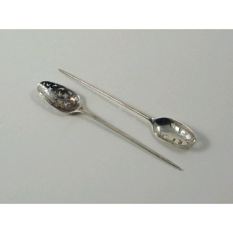A George I mote spoon, with a moulded rattail, and sparce piercing, makers mark only, possibly by Thomas Farren, London, c.1725, together with another later mote spoon. (2)