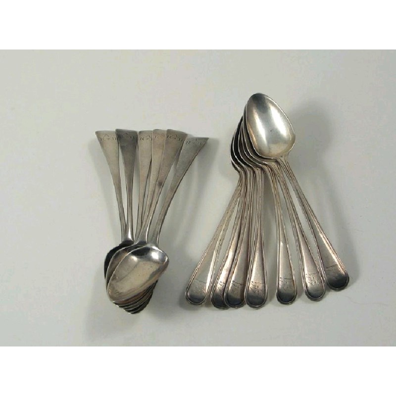 Two sets of George III teaspoons; an old English set of six, initialled, by S. Godbehere, E. Wigan and J. Bolt, London 1802; and a thread pattern set of seven by Richard Crossley, London 1788, 6oz.